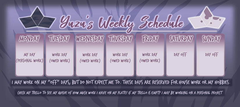 I currently am closed for commissions! I would like to open for Trades and Requests once I finish my owed queue, but no promises as I have several personal projects in the works.